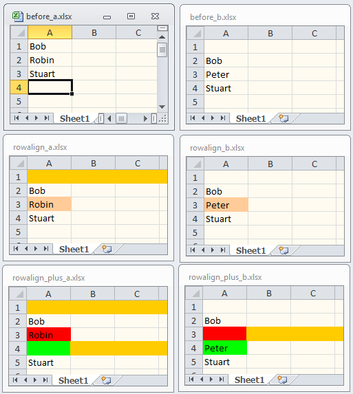rowalign_a.xlsx and rowalign_b.xlsx show the results of row alignment when Use Alignment Plus is unchecked. DiffEngineX has inserted a blank, yellow row in order to align the "Bob" and "Stuart" rows. The two different rows ("Robin" and "Peter") both end up in row 3 and have been colored because they are different. DiffEngineX has done its job: it has aligned similarities and reported the minimum number of differences.
